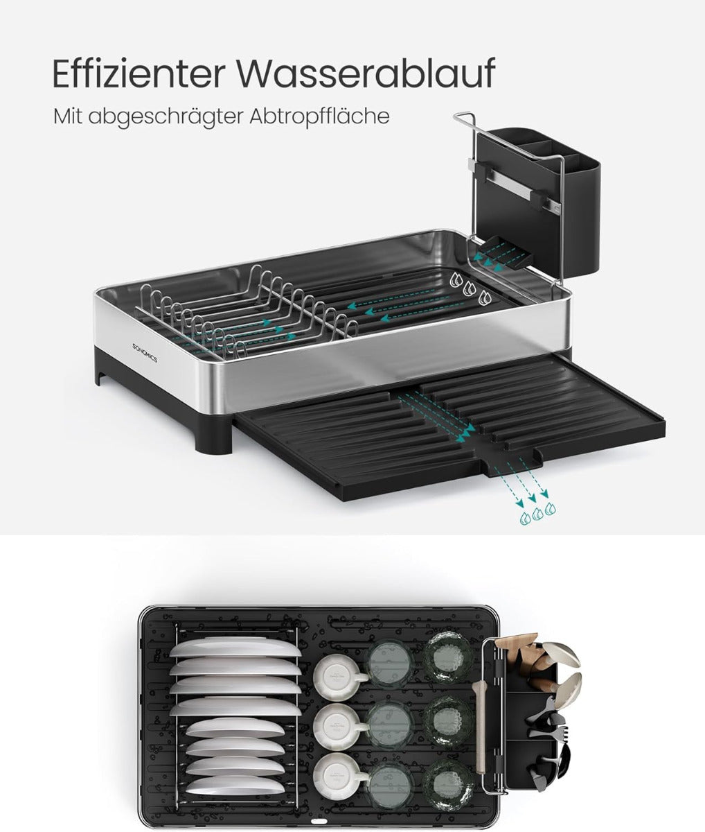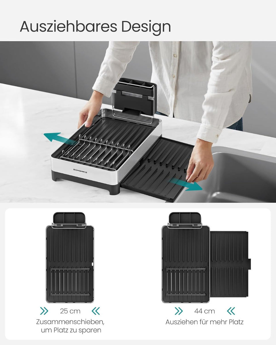 Stilvoll Ordnung schaffen: Mit dem ausziehbaren SONGMICS Abtropfgestell trocknest du dein Geschirr effizient und platzsparend. Ideal für kleine Küchen – robust, flexibel und mit cleverem Wasserablauf-System.