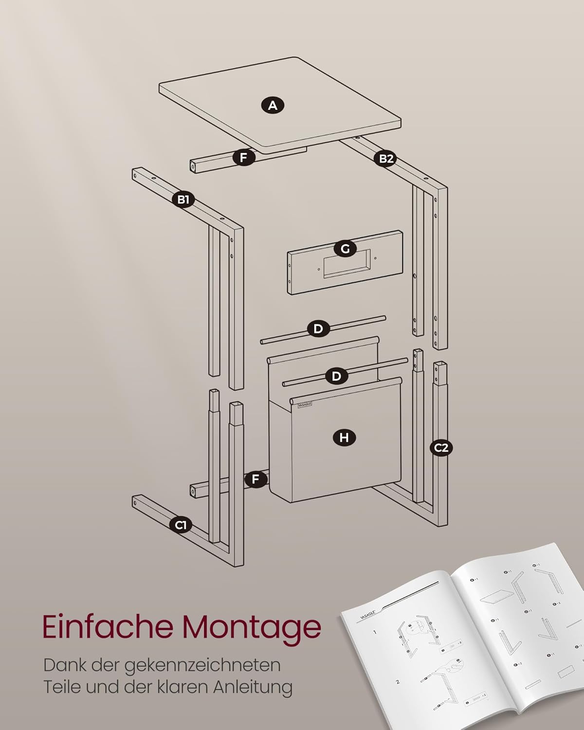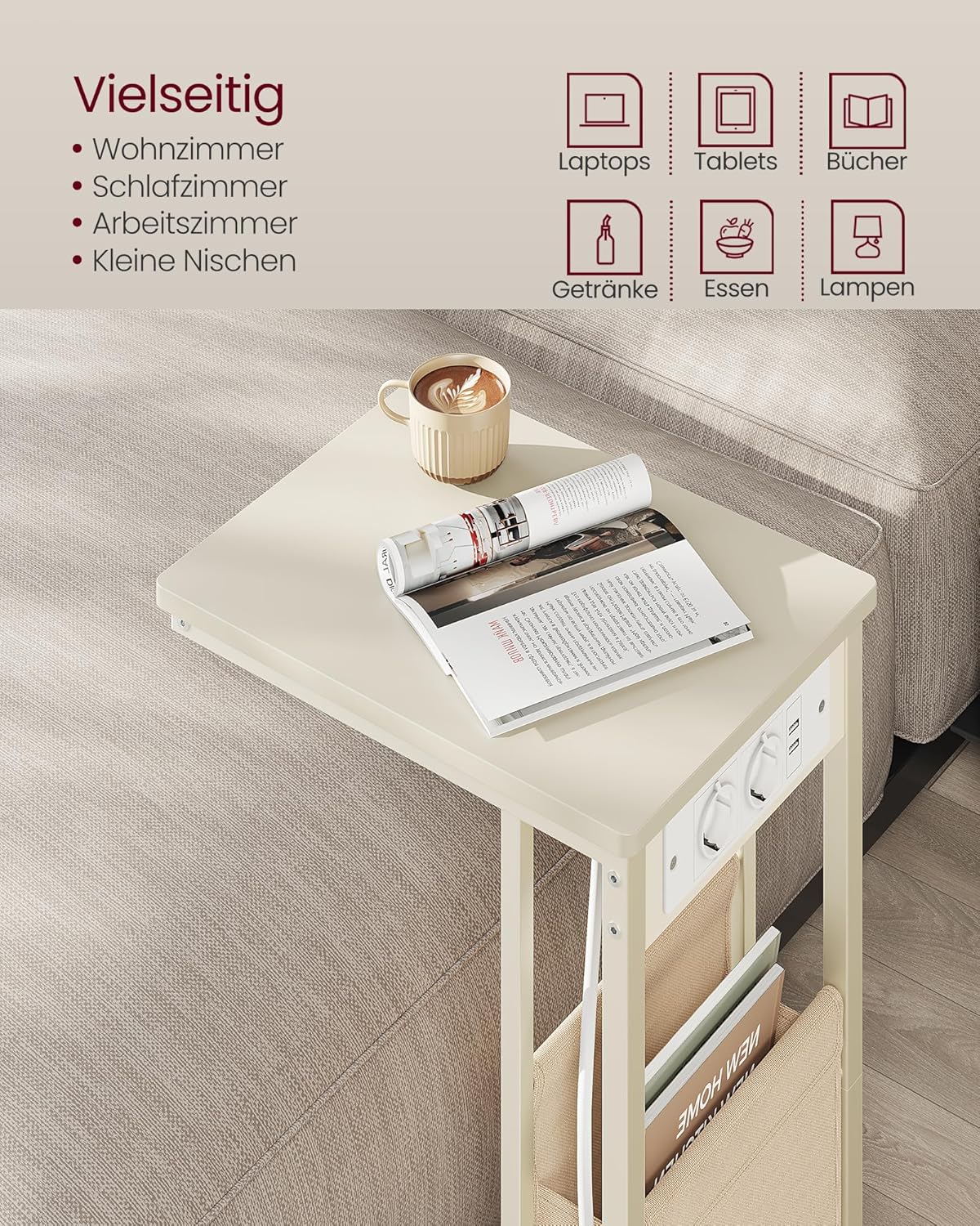 Entdecken Sie den SONGMICS Beistelltisch – die perfekte Lösung für alle, die Stil und Funktionalität in einem kompakten Design suchen. Mit seinen handlichen Massen von 30 x 40 x 62 cm passt dieser C-förmige Sofatisch mühelos in kleine Räume und lässt sich bequem unter Sofas oder Betten schieben. So geniessen Sie mehr Komfort, ohne dabei wertvollen Platz zu verlieren. Der SONGMICS Beistelltisch ist nicht nur ein Blickfang, sondern auch ein wahres Multitalent. Ausgestattet mit 2 Steckdosen und 2 USB-Anschlüssen, ermöglicht er das einfache Aufladen Ihrer Handys, Tablets und Laptops – ganz ohne Kabelsalat. Die praktische Stofftasche sorgt dafür, dass alltägliche Dinge wie Fernbedienungen oder Bücher stets griffbereit und ordentlich verstaut sind. Robust und langlebig, besteht dieser Tisch aus hochwertigen Spanplatten und einem stabilen Stahlrahmen, der Ihnen über Jahre hinweg treue Dienste leisten wird. Die Montage ist ein Kinderspiel: Dank der klaren Anleitung und der gekennzeichneten Teile können Sie Ihren neuen Couchtisch im Handumdrehen aufbauen. Vielseitig einsetzbar, eignet sich der SONGMICS Beistelltisch ideal für ein gemütliches Frühstück im Schlafzimmer oder als praktischer, temporärer Arbeitsplatz im Wohnzimmer. Stellen Sie ihn neben das Sofa, um Snacks und Fernbedienungen immer in Reichweite zu haben. Gönnen Sie sich den Komfort und die Funktionalität, die dieser Beistelltisch bietet – Ihr perfekter Begleiter für jeden Tag!
