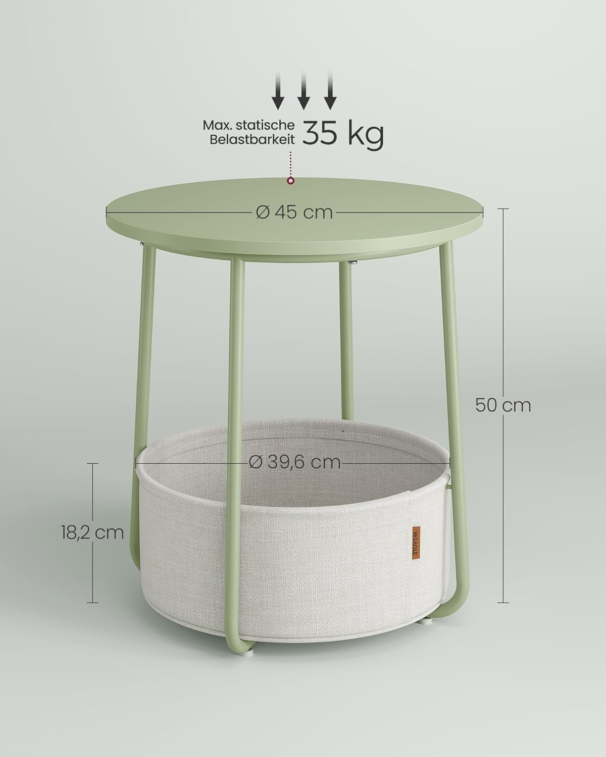 Entdecken Sie den SONGMICS Beistelltisch rund – die perfekte Lösung für kleine Räume! Mit einem Durchmesser von 45 cm und einer Höhe von 50 cm ist dieser kleine Couchtisch nicht nur platzsparend, sondern bietet auch einen praktischen Stauraum dank des stilvollen Korbs aus doppellagigem Polyestergewebe. Der Korb misst 39,6 cm im Durchmesser und 18,2 cm in der Höhe und fügt sich harmonisch in Ihr Wohnzimmer oder Schlafzimmer ein. Der Aufbau des Tisches ist kinderleicht und in nur 5-10 Minuten erledigt – dank der klaren Anleitung und der durchdachten Struktur. Die robuste Spanplatte sorgt für eine wackelfreie Stabilität, während die U-förmigen Beine aus Stahl für einen starken Halt garantieren. Verstellbare Füsse schützen Ihren Boden vor Kratzern und erhöhen die Stabilität des Tisches. Mit seiner modernen und schlichten Optik in Lorbeergrün und Cremeweiss fügt sich dieser Beistelltisch nahtlos in verschiedene Einrichtungsstile ein und verleiht Ihrem Raum einen Hauch von Eleganz. Der hochwertige Korb in Leinenoptik rundet das Gesamtbild ab und sorgt für eine sichere Nutzung ohne chemische Beschichtungen. Setzen Sie auf Stil und Funktionalität mit dem SONGMICS Beistelltisch – der ideale Begleiter für Ihr Zuhause!