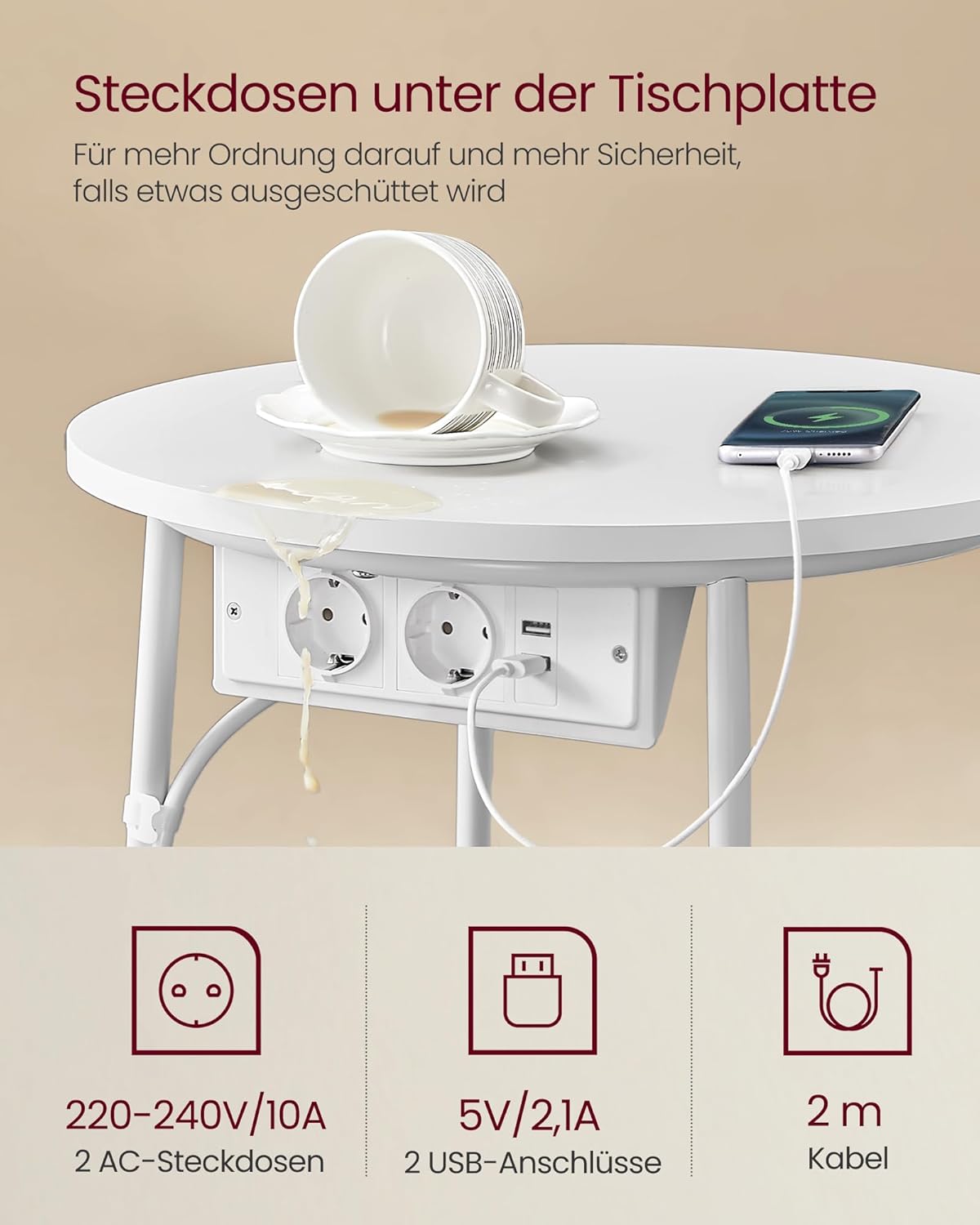 Beistelltisch mit Steckdose Stauraum, Mattweiss-Kamelbraun