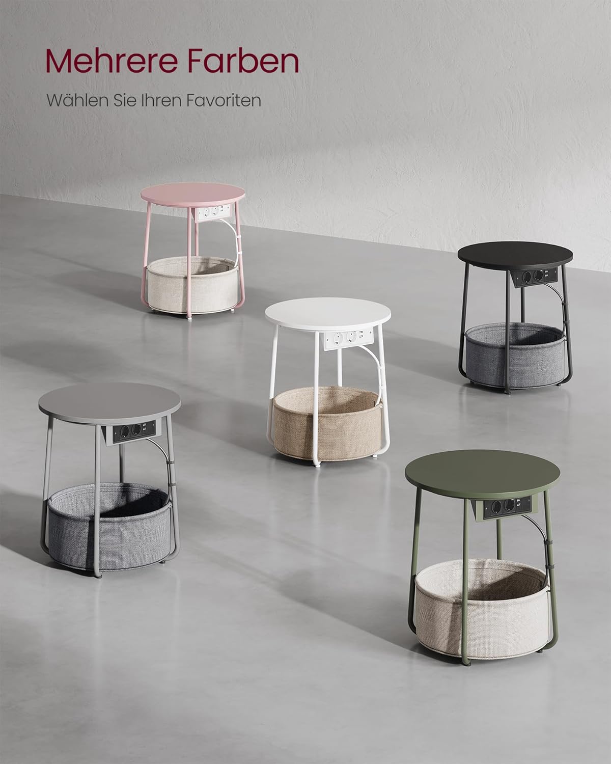 Platzsparender Couchtisch (45 cm Ø, 50 cm hoch) für Wohnzimmer oder Schlafzimmer, Integrierter, chemiefreier Korb aus doppellagigem Polyester für sicheren Stauraum, Stabile Spanplatte und Stahl-U-Beine mit verstellbaren Füßen für wackelfreien Stand