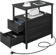 Integrierte Steckdosenleiste mit 2 AC- und 2 USB-Anschlüssen zum bequemen Laden, Viel Stauraum mit zwei Schubladen, zwei offenen Ablagen und Zeitschriftenhalter, Robuste Konstruktion aus Stahl und Holzspanplatten, trägt bis zu 91 kg und passt in enge Räume