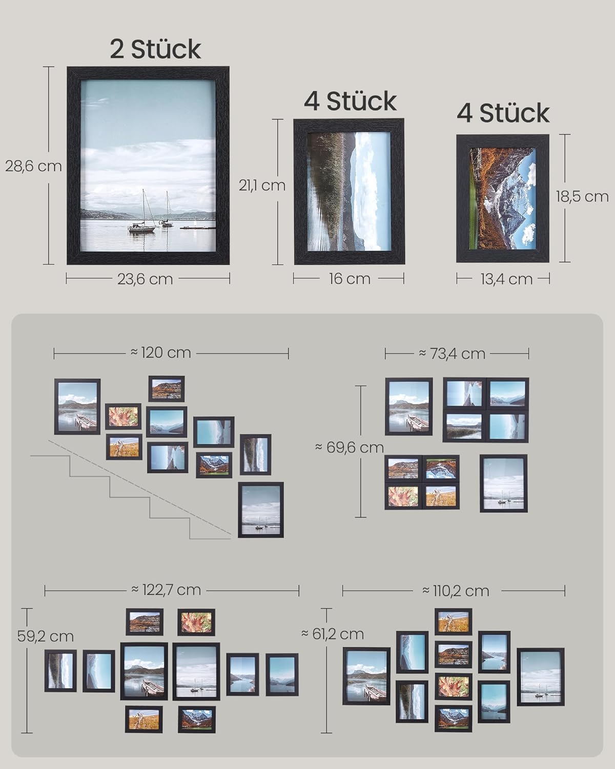 Vielseitige Präsentation in drei Fotoformaten, Für Wandmontage und Stellflächen geeignet, Schützt Bilder mit stabilem MDF und kratzfester Kunststoffscheibe