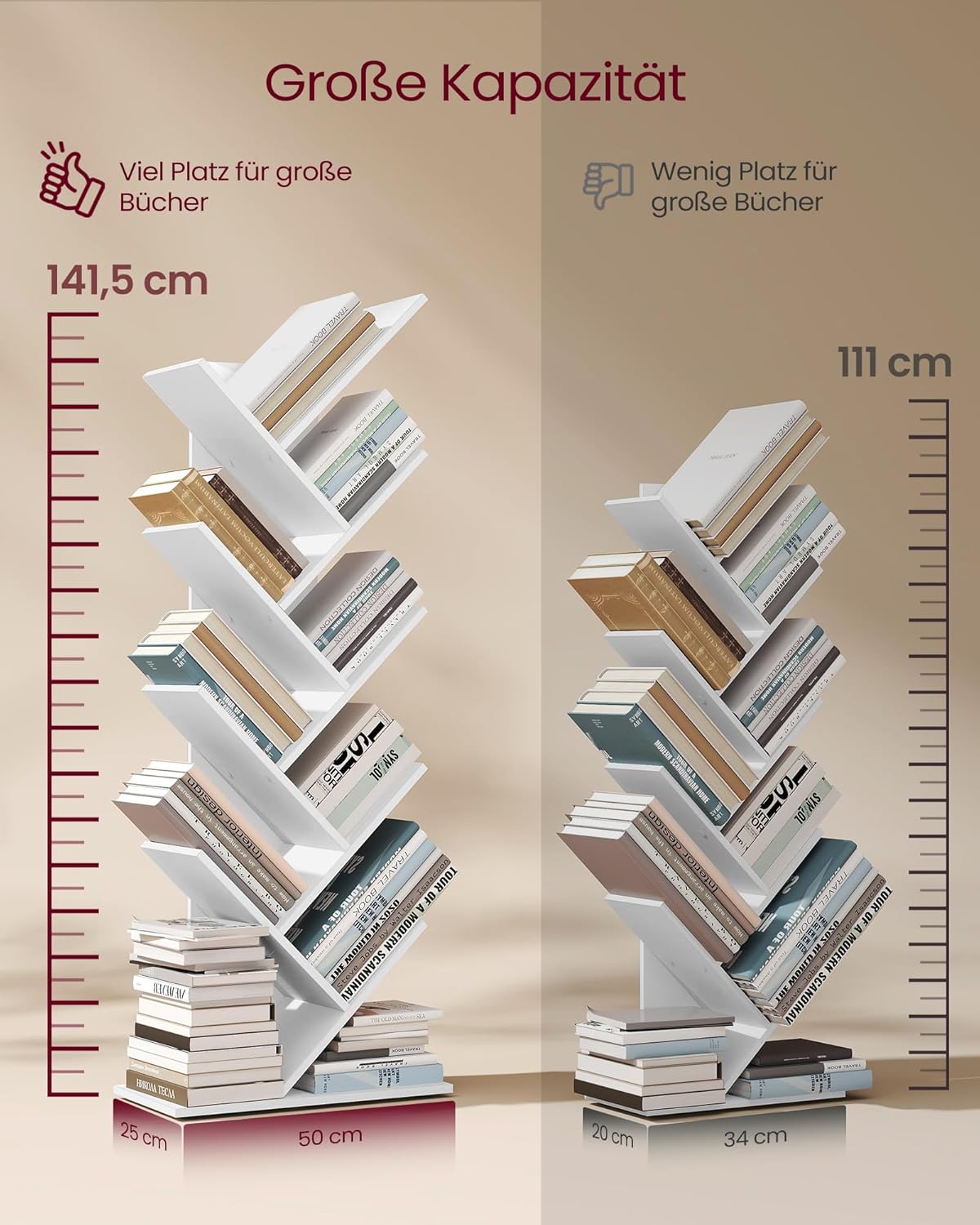 Entdecken Sie das SONGMICS Bücherregal in Baumform – eine harmonische Verbindung von Stil und Funktionalität! Dieses elegante Standregal mit 9 Ebenen bringt nicht nur einen Hauch von Natur in Ihr Zuhause, sondern hilft Ihnen auch, Ordnung in Ihrem Homeoffice, Wohnzimmer oder Schlafzimmer zu schaffen. Mit kompakten Massen von 25 x 50 x 141,5 cm ist dieses Eckregal der perfekte Raumwunder für gemütliche Ecken und kleine Nischen. Es bietet Ihnen ausreichend Platz, um Bücher, DVDs und Zeitschriften platzsparend unterzubringen und sorgt so für eine optimale Stauraumnutzung. Die robuste Struktur des Regals garantiert Langlebigkeit und Sicherheit, da jede Ebene bis zu 10 kg tragen kann. Der beiliegende Kippschutz ermöglicht eine sichere Wandmontage, sodass Sie sich keine Sorgen um die Stabilität machen müssen. Hergestellt aus hochwertigen Spanplatten mit strapazierfähigen Furnieroberflächen, ist dieses Aufbewahrungsregal nicht nur pflegeleicht, sondern auch äusserst langlebig. Ein einfaches Wischen mit einem feuchten Tuch genügt, um es in neuem Glanz erstrahlen zu lassen. Der Zusammenbau des SONGMICS Bücherregals ist kinderleicht – ganz ohne zusätzliches Werkzeug! Dank klar gekennzeichneter Teile und einer verständlichen Anleitung ist Ihr neues Regal im Handumdrehen einsatzbereit. Bringen Sie mit dem SONGMICS Bücherregal in Baumform Stil und Ordnung in Ihr Zuhause!