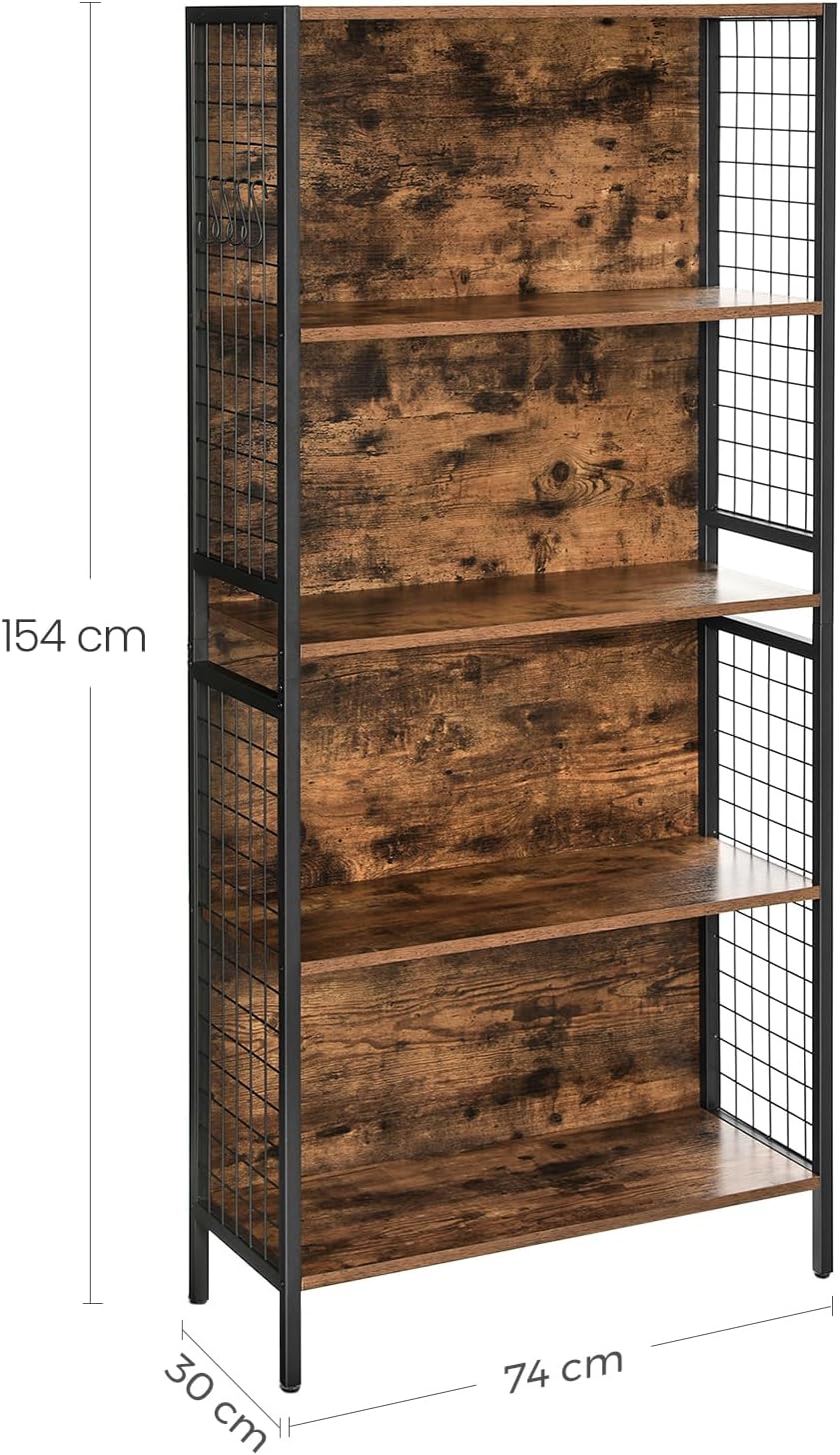 Entdecken Sie das SONGMICS Bücherregal – die perfekte Kombination aus Stil und Funktionalität für Ihr Zuhause oder Büro. Mit seinen eleganten Massen von 30 x 74 x 154 cm und dem ansprechenden Design in vintagebraun und tintenschwarz fügt sich dieses Standregal harmonisch in jede Umgebung ein, sei es im Wohnzimmer, Arbeitszimmer oder Büro. Die fünf grosszügigen Ablagen bieten reichlich Stauraum für Bücher, Dekoration oder Bürobedarf. Dank der durchdachten seitlichen Gitterplatten bleibt alles sicher an seinem Platz, während die vier praktischen S-Haken ideal sind, um Kopfhörer, Taschen oder andere Utensilien griffbereit aufzuhängen. Hergestellt aus hochwertiger Spanplatte und robustem Premium-Stahl, überzeugt das Regal nicht nur durch seine ansprechende Optik, sondern auch durch Stabilität und Sicherheit. Jede Ablage trägt bis zu 20 kg, und die verstellbaren Füsse sorgen dafür, dass das Regal auch auf unebenen Böden fest steht. Der integrierte Kippschutz bietet zusätzlich Sicherheit, besonders in Haushalten mit Kindern oder Haustieren. Die Montage ist ein Kinderspiel: Mit der klaren Anleitung und den beschrifteten Teilen ist Ihr neues Bücherregal im Handumdrehen einsatzbereit. Verleihen Sie Ihrem Raum mit dem SONGMICS Bücherregal einen Hauch von Vintage-Charme und geniessen Sie die perfekte Mischung aus Stil und praktischer Nutzung!