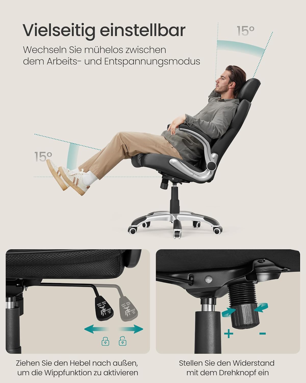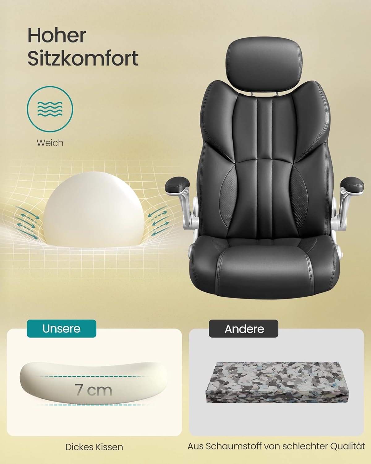 Kunden begeistern vor allem der hohe Sitzkomfort und die durchdachte Ergonomie: verstellbare Kopfstütze, Wippfunktion und höhenverstellbare Sitzfläche. Gelobt werden die weichen Armlehnen mit Nylon-Unterbau, die stabile Konstruktion bis 150 kg, leicht zu reinigender PU-Bezug sowie das sportliche Design. Klappbare Armlehnen und laufruhige Rollen fürs flexible Unterstellen und mühelose Bewegung runden das positive Gesamtbild ab.
