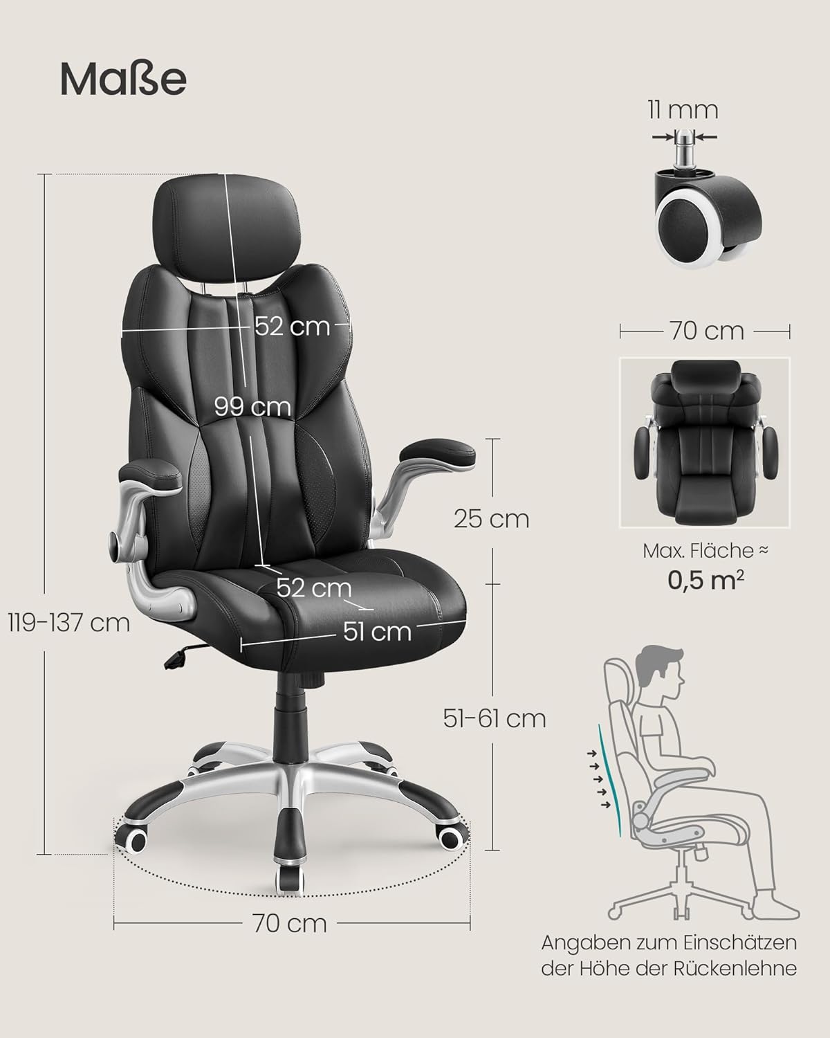 Der SONGMICS OBG65BK Bürostuhl in elegantem Tintenschwarz vereint sportliches Design und durchdachte Ergonomie für langes, komfortables Sitzen: Mit einer Gesamthöhe von 120–137 cm, einer Produktbreite von 70 cm und einer Tiefe von 75 cm passt er gut an Schreibtische und in Konferenzräume, während die Sitzfläche mit 48 cm Breite, 53 cm Tiefe und höhenverstellbaren 45–53 cm Sitzhöhe individuellen Sitzkomfort ermöglicht; die robuste Konstruktion aus Nylon-Rollen und Nylon-Sternfuss, einer hochwertigen Gasdruckfeder und einer stabilen Sitzfläche trägt bis zu 150 kg bei einem Gesamtgewicht von 17,5 kg. Der Bezug kombiniert pflegeleichtes Kunstleder (PU) mit Polyester und einer bequemen Schaumstoffpolsterung, die zusammen mit der verstellbaren Kopfstütze und der Wippfunktion für ergonomische Unterstützung und entspannende Pausen nach langen Arbeitssitzungen sorgt. Die Armlehnen besitzen Nylon-Unterbau und eine weichere Polyurethan-Auflage für angenehmen Armkontakt; die lastabhängigen automatisch einrastenden Rollen sorgen für sichere Standfestigkeit beim Aufstehen und freies Rollen beim Sitzen. Optisch setzt der Stuhl mit kontrastreichem, sportlichem Look Akzente und verleiht Büro, Home-Office oder Gaming-Setup Dynamik, zugleich ist der Bezug leicht zu reinigen und langlebig. Im Lieferumfang enthalten sind 1x Bürostuhl, 1x Inbusschlüssel, 1x Zubehörbeutel und 1x leicht verständliche Bedienungsanleitung mit gekennzeichneten Teilen sowie klappbare Armlehnen, die das platzsparende Unterstellen unter dem Schreibtisch erleichtern — ein zuverlässiger, hochwertiger Bürostuhl, der Komfort, Stabilität und modernes Design vereint.