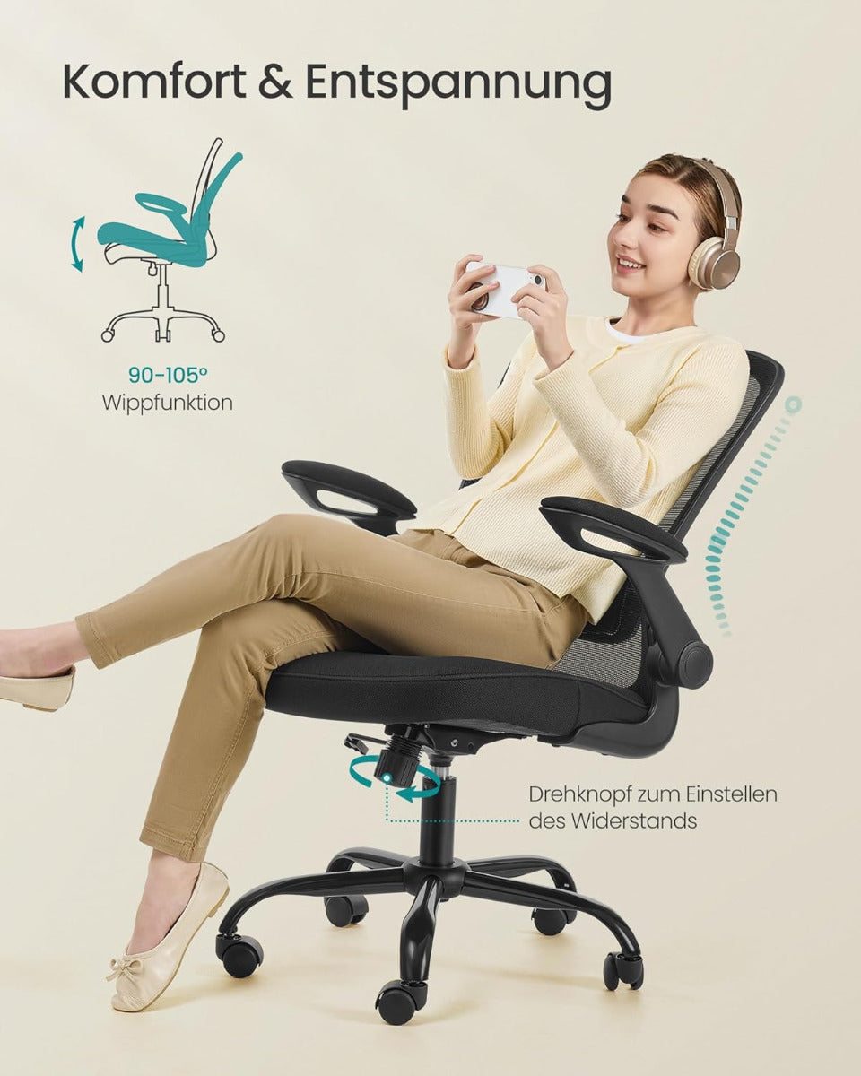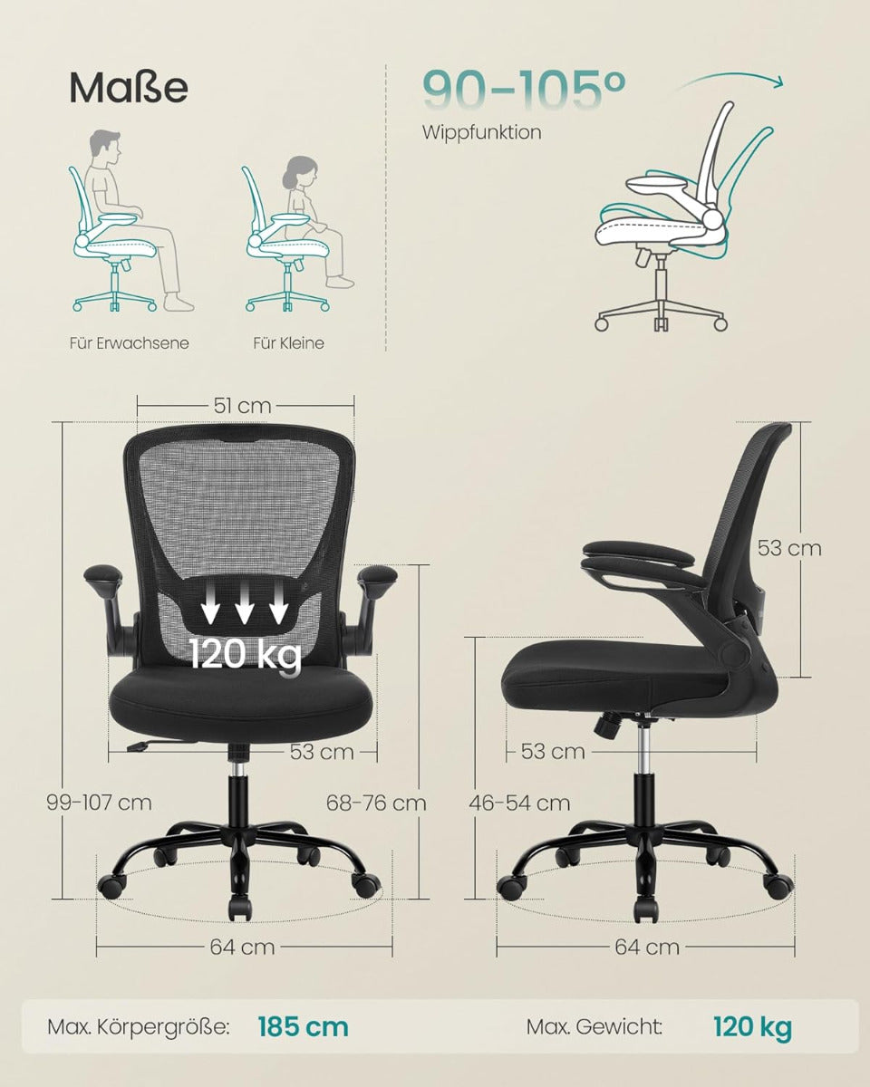 Entdecken Sie den ergonomischen Schreibtischstuhl mit hochklappbaren Armlehnen – die smarte Wahl für alle, die Wert auf Komfort, Funktionalität und Stil legen. Ob im Home Office, Büro oder beim Gaming – dieser Stuhl bietet Ihnen zuverlässige Unterstützung für einen gesunden und bequemen Sitzalltag. Die rückenfreundliche S-förmige Lehne (53 x 51 cm) passt sich Ihrer Wirbelsäule optimal an und wird durch eine gepolsterte, in der Höhe verstellbare Lendenstütze ergänzt. So wird Ihr Rücken gezielt entlastet und Ermüdung bei längerem Sitzen reduziert. Die 22 cm hohen Armlehnen lassen sich bei Bedarf einfach hochklappen – ideal, um den Stuhl nach Gebrauch platzsparend unter den Schreibtisch (ab ca. 66 cm Höhe) zu schieben. Der Stuhl bietet eine individuell einstellbare Sitzhöhe von 46 bis 54 cm und eine angenehm breite Sitzfläche von 53 x 53 cm. Die dicke Sitzpolsterung aus 6 cm Schaumstoff ist weder zu weich noch zu hart und sorgt für ein komfortables Sitzgefühl auch über Stunden hinweg. Das atmungsaktive Stoffmaterial ermöglicht eine gute Luftzirkulation, was besonders an warmen Tagen für zusätzlichen Komfort sorgt. Zusätzlich ist der Stuhl mit einer praktischen Wippfunktion (von 90° bis 105°) ausgestattet – so wechseln Sie ganz einfach zwischen konzentriertem Arbeiten und entspannter Pause. Die Gesamtmasse betragen 66 x 60 x 99–107 cm (L x B x H), was eine kompakte, aber dennoch komfortable Sitzlösung darstellt. Für Stabilität sorgt ein robuster Stahlrahmen kombiniert mit einer qualitativ hochwertigen Gasdruckfeder und einem standsicheren Fusskreuz. Der Stuhl trägt ein maximales Benutzergewicht von bis zu 120 kg. Die clever konstruierten Rollen verfügen über eine automatische Bremsfunktion: Beim Aufstehen blockieren sie, beim Hinsetzen lösen sie sich – für Sicherheit und Komfort in jeder Situation.