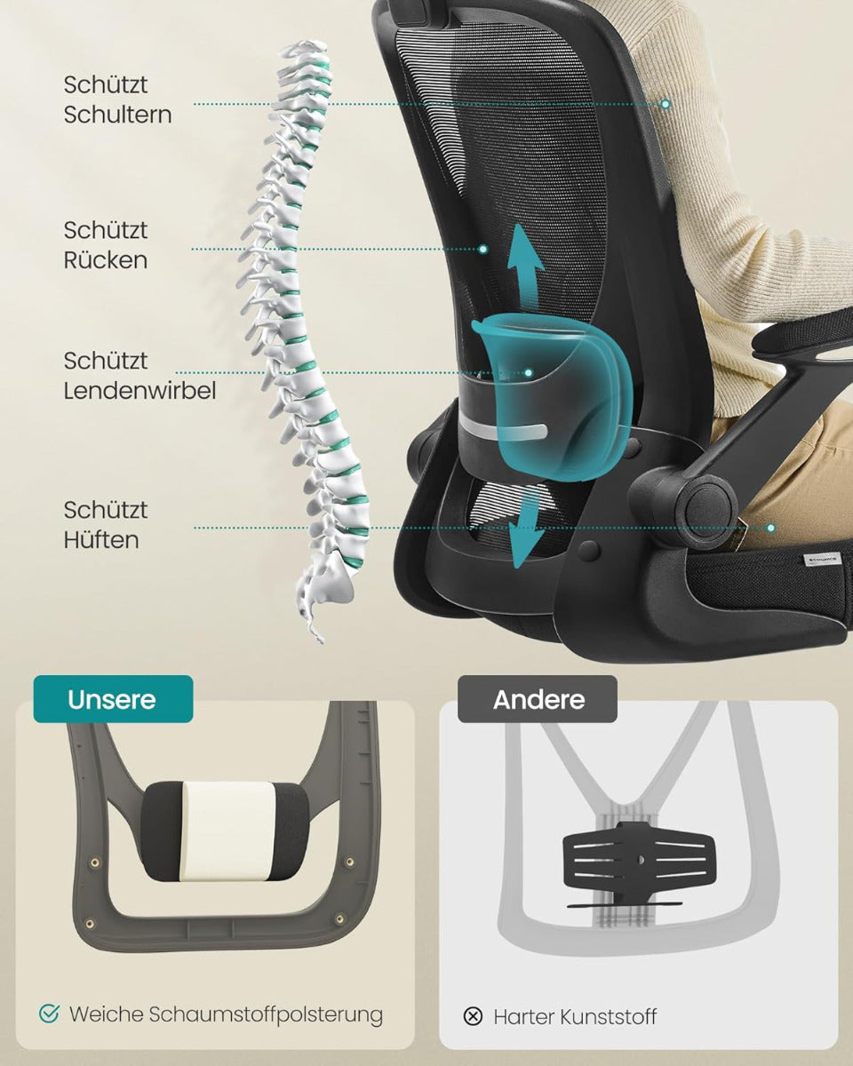 Ergonomische S‑förmige Rückenlehne mit verstellbarer Lendenstütze, Hochklappbare Armlehnen zum platzsparenden Unterstellen, Höhenverstellbarer Sitz mit Wippfunktion für flexibles Arbeiten