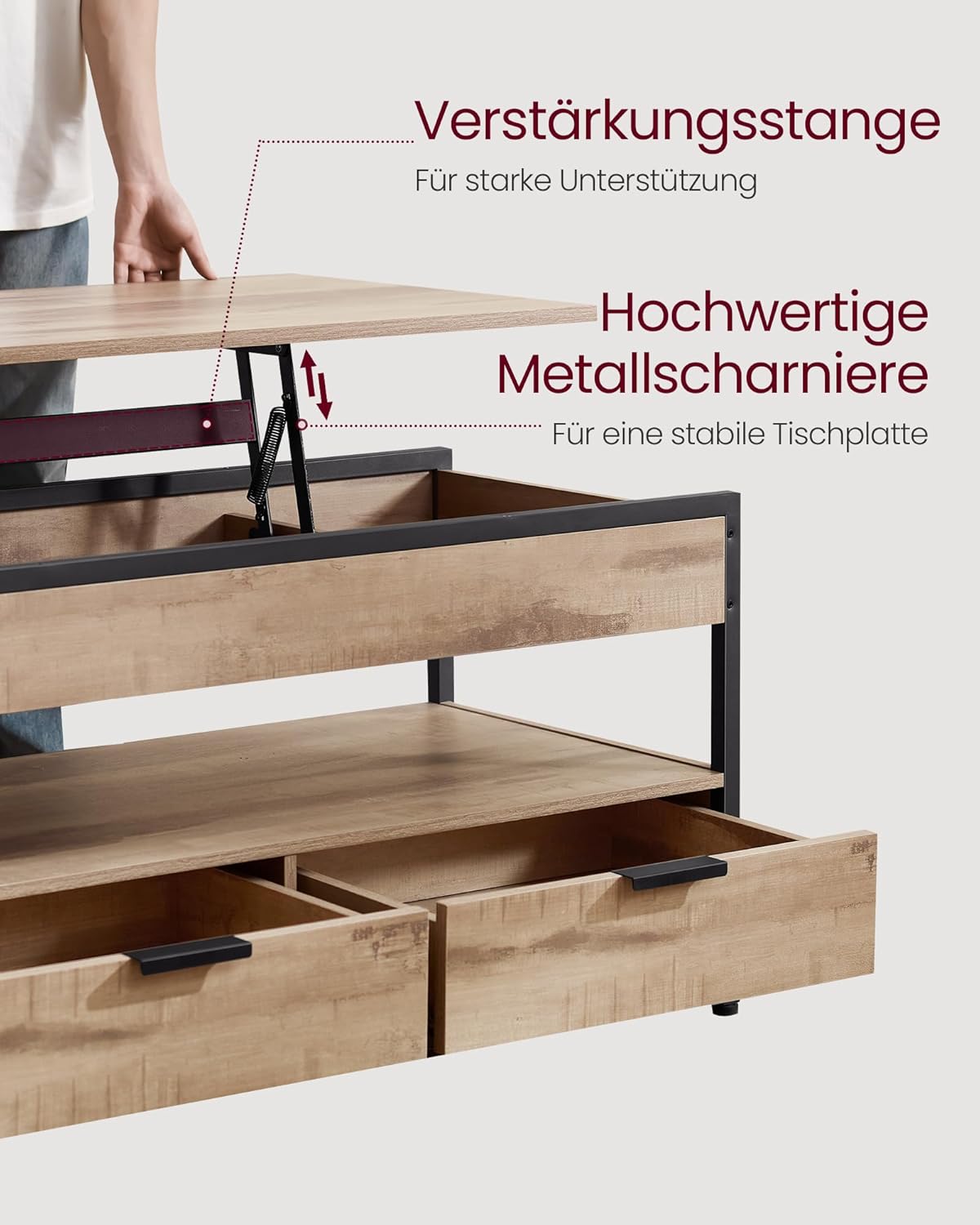 Höhenverstellbares Lift‑Top für stufenlose Anpassung beim Arbeiten oder Essen, Großer Stauraum mit offener Ablage, drei versteckten Fächern und zwei Schubladen, Stabile Konstruktion trägt bis zu 136 kg und 20 kg im angehobenen Zustand