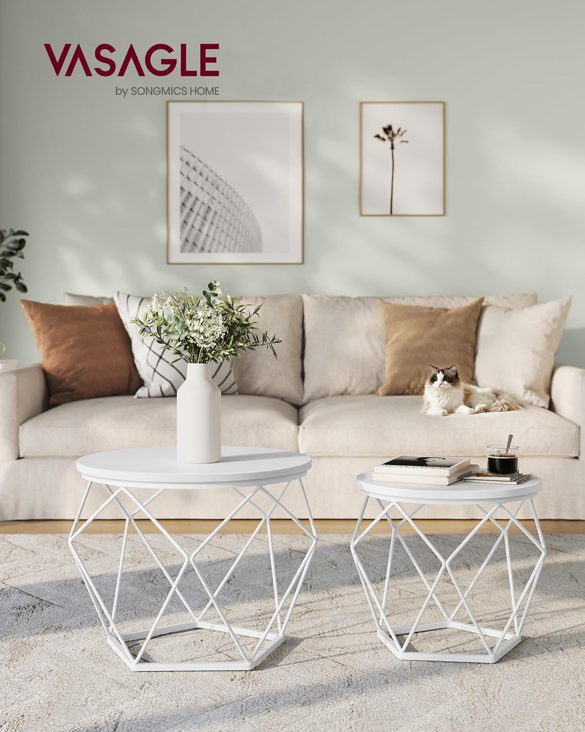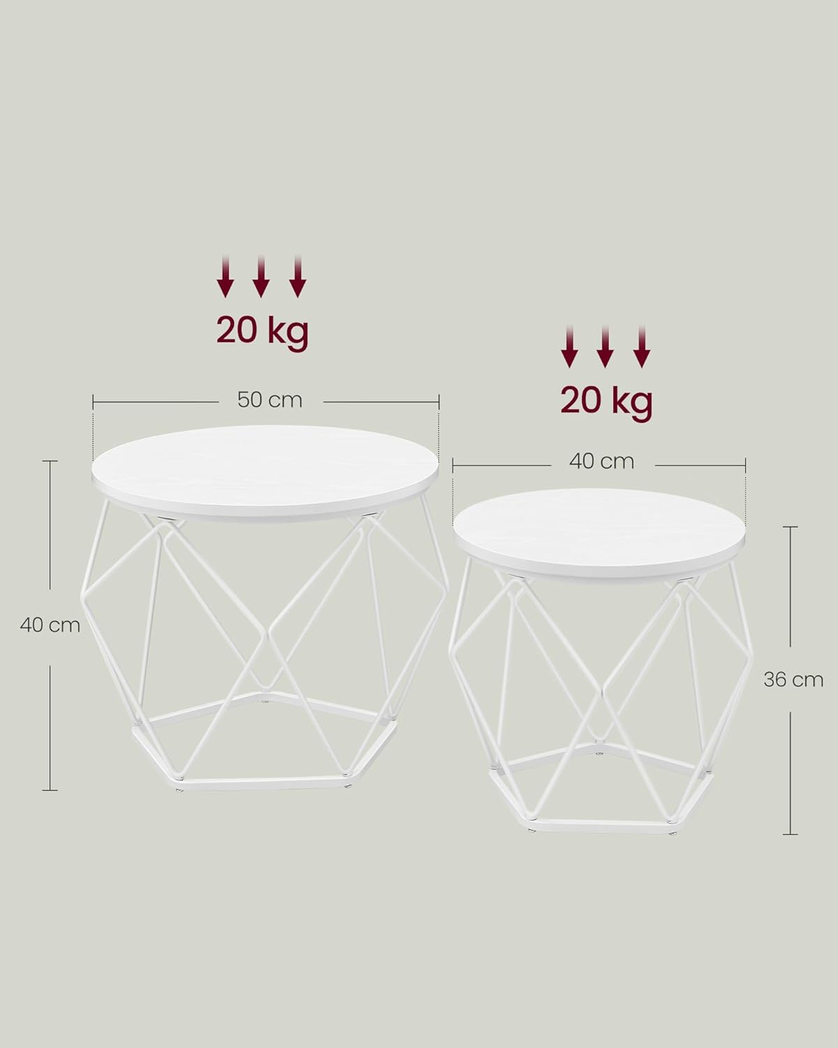 Entdecken Sie den SONGMICS Couchtisch rund im praktischen 2er Set – die perfekte Ergänzung für Ihr Wohnzimmer! Mit einem grossen Tisch von 50 cm Durchmesser und 40 cm Höhe sowie einem kleinen Tisch von 40 cm Durchmesser und 36 cm Höhe sind diese Beistelltische ideal für kleine Räume. Ob für Ihren Nachmittagstee, dekorative Accessoires oder Ihren Laptop – hier findet alles seinen Platz. Der Aufbau ist kinderleicht! Dank der klaren Anleitung und der gekennzeichneten Teile können Sie das Couchtisch-Set im Handumdrehen zusammenbauen. Und falls Ihnen einmal eine Schraube entgleitet, keine Sorge – im Zubehörpaket sind Ersatzteile enthalten. Robust und stabil, überzeugen diese Kaffeetische durch ihre hochwertige Verarbeitung. Die Kombination aus langlebigen Holzspanplatten und einer soliden Stahlkonstruktion sorgt dafür, dass die Tische nicht wackeln, selbst wenn Sie Ihre Kaffeetasse abstellen. Jeder Tisch kann bis zu 20 kg tragen, sodass Sie sich keine Gedanken über die Belastbarkeit machen müssen. Flexibilität wird bei diesem Set grossgeschrieben! Nutzen Sie die beiden Sofatische zusammen für eine harmonische Kombination im Wohnzimmer oder getrennt – einen neben dem Sofa und den anderen im Schlafzimmer. So bringen Sie die Stärken beider Tische voll zur Geltung. Der moderne Stil dieses Tisch-Sets verleiht Ihrem Raum einen besonderen Touch. Die runde Platte in schneeweiss und das geometrische Gestell aus wolkenweissem Stahl werden die Augen Ihrer Gäste zum Strahlen bringen. Setzen Sie Akzente in Ihrem Zuhause mit dem SONGMICS Couchtisch rund – stilvoll, praktisch und vielseitig!
